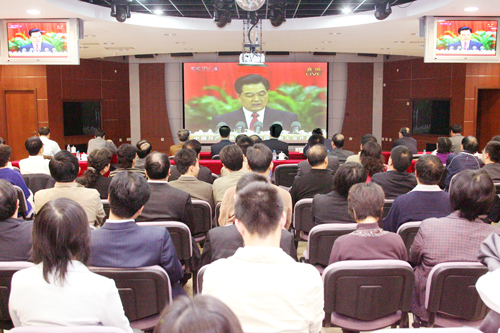 雖然因為人員太多而略顯擁擠,但整個會場卻非常安靜,就連每逢會議難免嗡嗡作響的手機似乎也絕了聲。大家都在認真地傾聽,有的詳細地做著記錄,有的還時不時地將身子輕輕探起,生怕錯過電視里傳出的只言片語……10月15日上午,中核集團公司黨組成員、副總經(jīng)理孫又奇,黨組成員王森,以及老領導趙宏、李忠良、錢福源等與集團公司總部、檔案館、金原鈾業(yè)公司、新聞宣傳中心、二二一局的干部職工一起收看了中共十七大開幕式的現(xiàn)場直播,聆聽了胡錦濤總書記所作的報告。