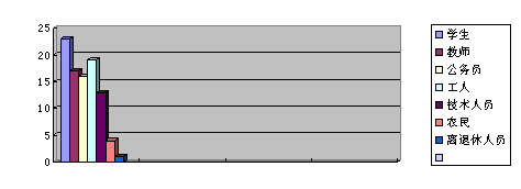 調(diào)查共收回問(wèn)卷 93 份,回收率為 93% 。在被調(diào)查人群中,男性 48 人,女性 45 人(圖 1 ),其中有 37 人的日常生活中與電磁波有直接的聯(lián)系,其余 56 人都不同程度的接觸電磁波(圖 2 )。在被調(diào)查的人群中,有 23 名學(xué)生, 17 名教師, 16 名公務(wù)員, 19 名工人,技術(shù)人員 13 名,農(nóng)民 4 名,離(退)休人員 1 名。